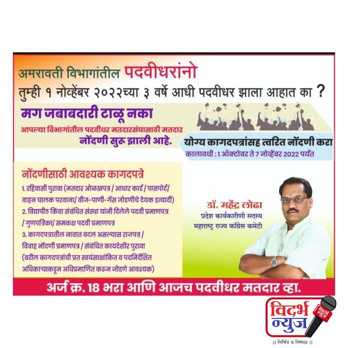 त्यामुळे वणी विधानसभा क्षेत्रातील महाराष्ट्र राज्य काँग्रेस कमिटीचे प्रदेश कार्यकारणी सदस्य डॉ महेंद्र लोढा यांनी पुढाकार घेऊन स्वतः व कार्यकर्त्यांसोबत मतदार नोंदणी अर्ज क्रमांक 18 घेऊन मतदार संघात निघाले आहे व मतदार संघातील पदवीधरांना आवाहन करण्यात येत आहे की 1 नोव्हेंबर 2022 च्या 3 वर्षे आधी पदवीधर झाला असेल तर त्याने योग्य कागदपत्रांसह 1 ऑक्टोबर ते 7 नोव्हेंबर 2022 पर्यंत नोंदणी करावी असे आवाहन केले आहे.